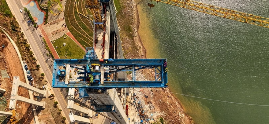 经过1个小时的牵引,长达2000米的先导索成功跨越1100多米的江面,与南主塔下方的钢丝过渡索成功连接,并在南北岸塔顶卷扬机的配合下,提升至江面40米的高空。至此,先导索过江作业完成,双塔成功实现跨江“牵手”。