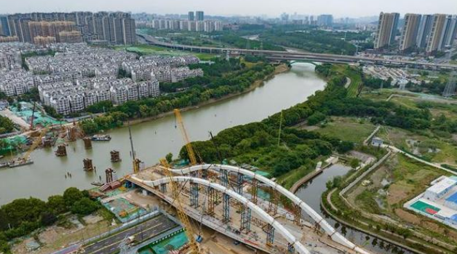 6月3日,航拍南京梅苑南路跨秦淮新河大桥施工现场。近日,南京梅苑南路跨秦淮新河大桥建设有序推进,大桥主体结构已经全部吊装完成,目前,施工方中建三局的建设者正在进行箱梁焊接、顶推设备调试和临时支墩的安装。梅苑南路跨秦淮新河大桥建设工程项目位于南京市雨花台区,路线总长约850米,建成通车后将进一步改善区域交通环境,为市民出行提供便利。